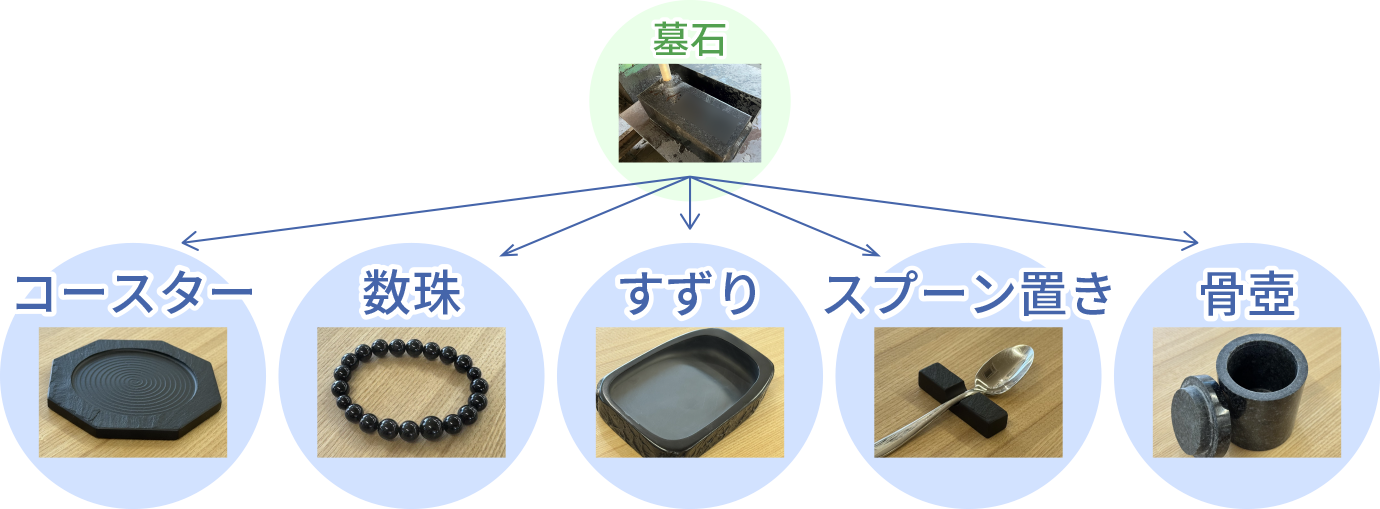 廃棄する墓石材から、すずりや箸置き、コースター、薄いプレート、ペン立てなどの日用品を制作します 。故人を常に身近に感じられるよう、お客様のアイデアを形にし、日常に寄り添う品々として再生させることが可能です。