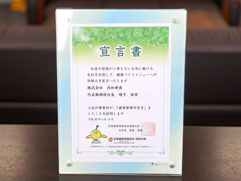 社員の健康が重要な経営資源と捉えられる昨今、共和建商は協会けんぽの実施する「健康事業所宣言」に取り組んでいます。