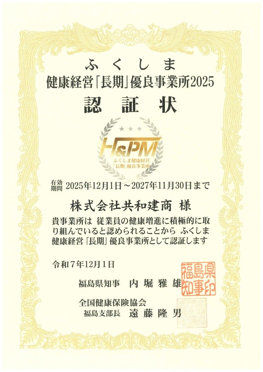 共和建商 健康経営優良法人2025(中小規模法人部門)「認定証」を取得しました。